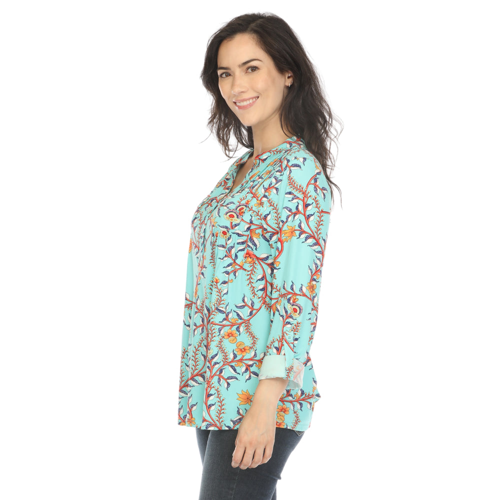 Step into classic elegance with this Paisley Button-Front Tunic Top. The sophisticated buttoned V-neckline offers a refined touch, while the relaxed fit ensures all-day comfort and a flattering drape. Designed with long sleeves that feature a roll-tab option, this tunic allows you to switch up your look with ease. The functional chest pockets add a hint of casual charm, and the timeless paisley pattern brings a touch of artistry and tradition. Pair this tunic with your favorite leggings or jeans for a polished yet comfortable outfit.